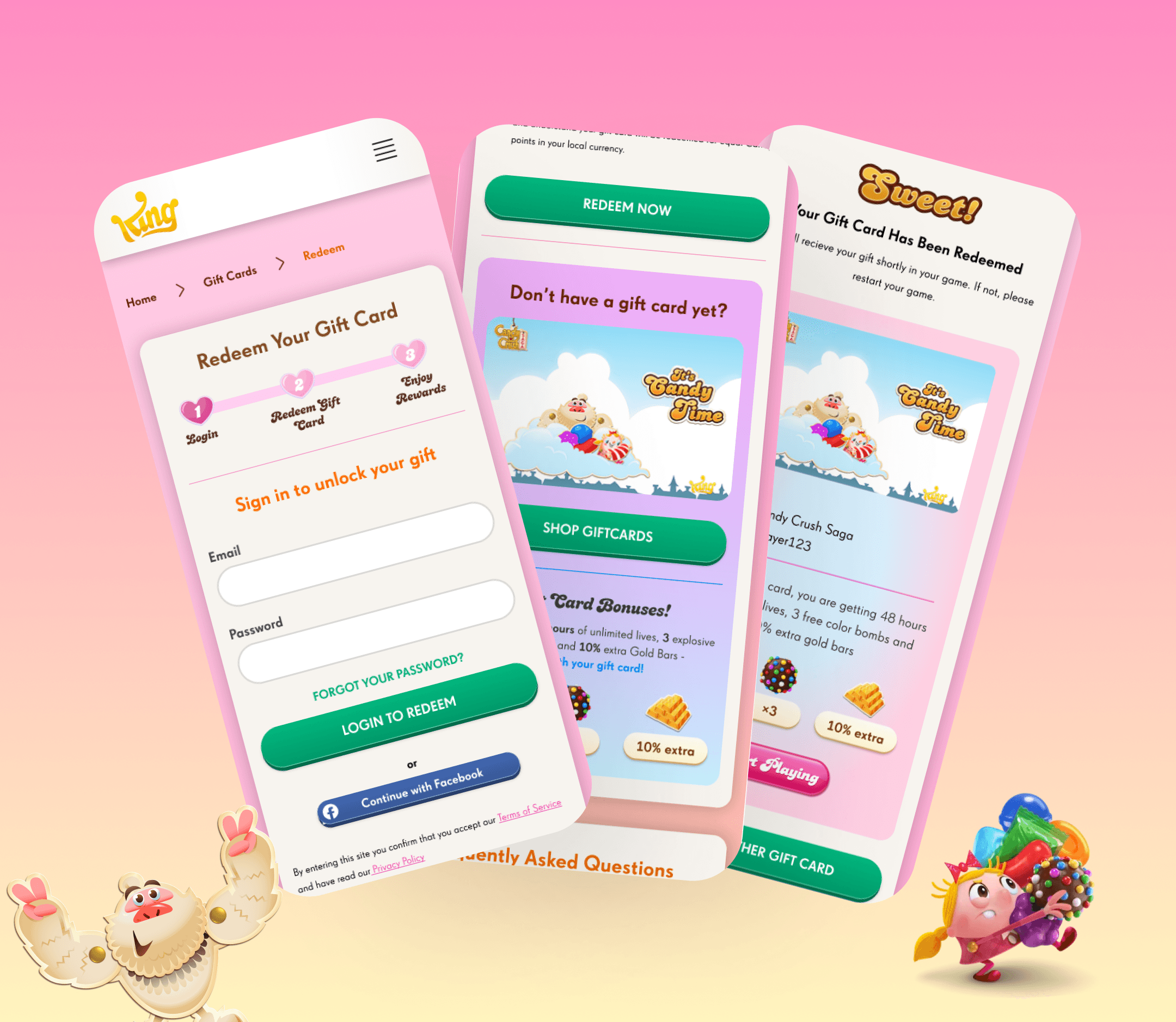 I structured the redesign into two parallel flows — one for redeeming a Candy Crush gift card, and the other for purchasing one. My goal was to elevate the experience from functional to delightful while reducing confusion and drop-off.